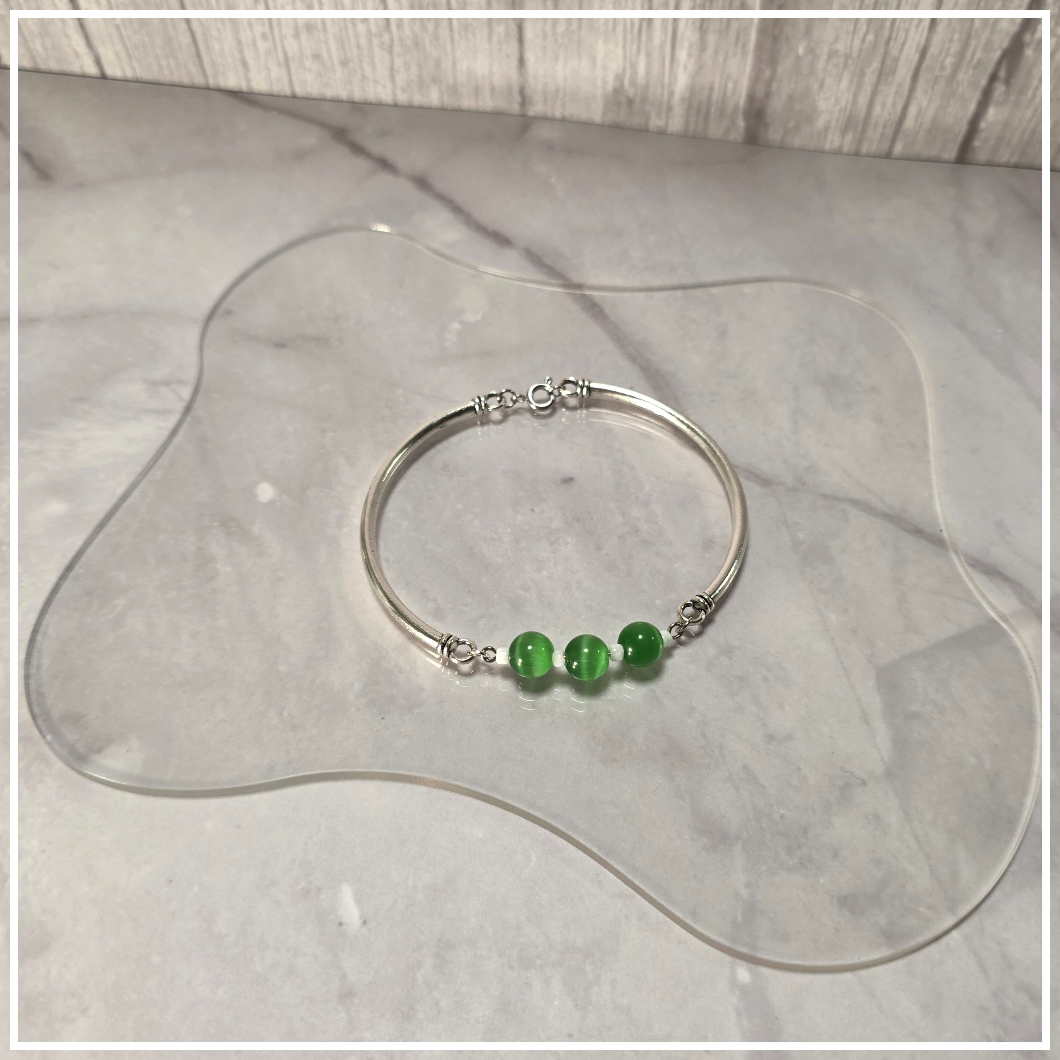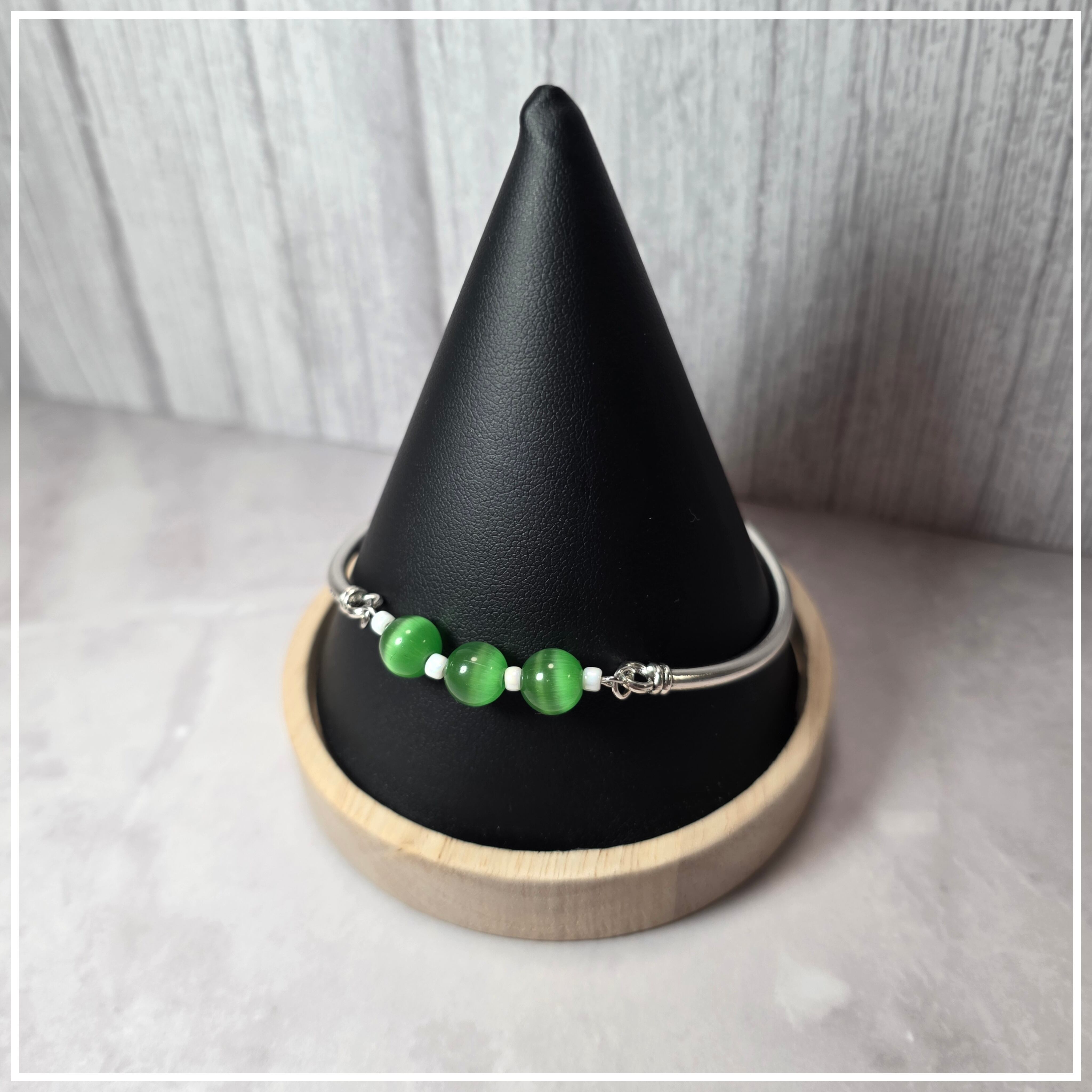 グリーンカラーが魅力の天然石キャットアイスストーンを使用したブレスレットです。見る角度によって変わる美しいラインが、あなたの手元を優雅に飾ります。特別な日のおしゃれなアイテムとしても、普段使いにもぴったりです。天然石の特性を活かし、一つ一つの風合いが異なるため、世界に一つだけの個性を楽しんでいただけます。