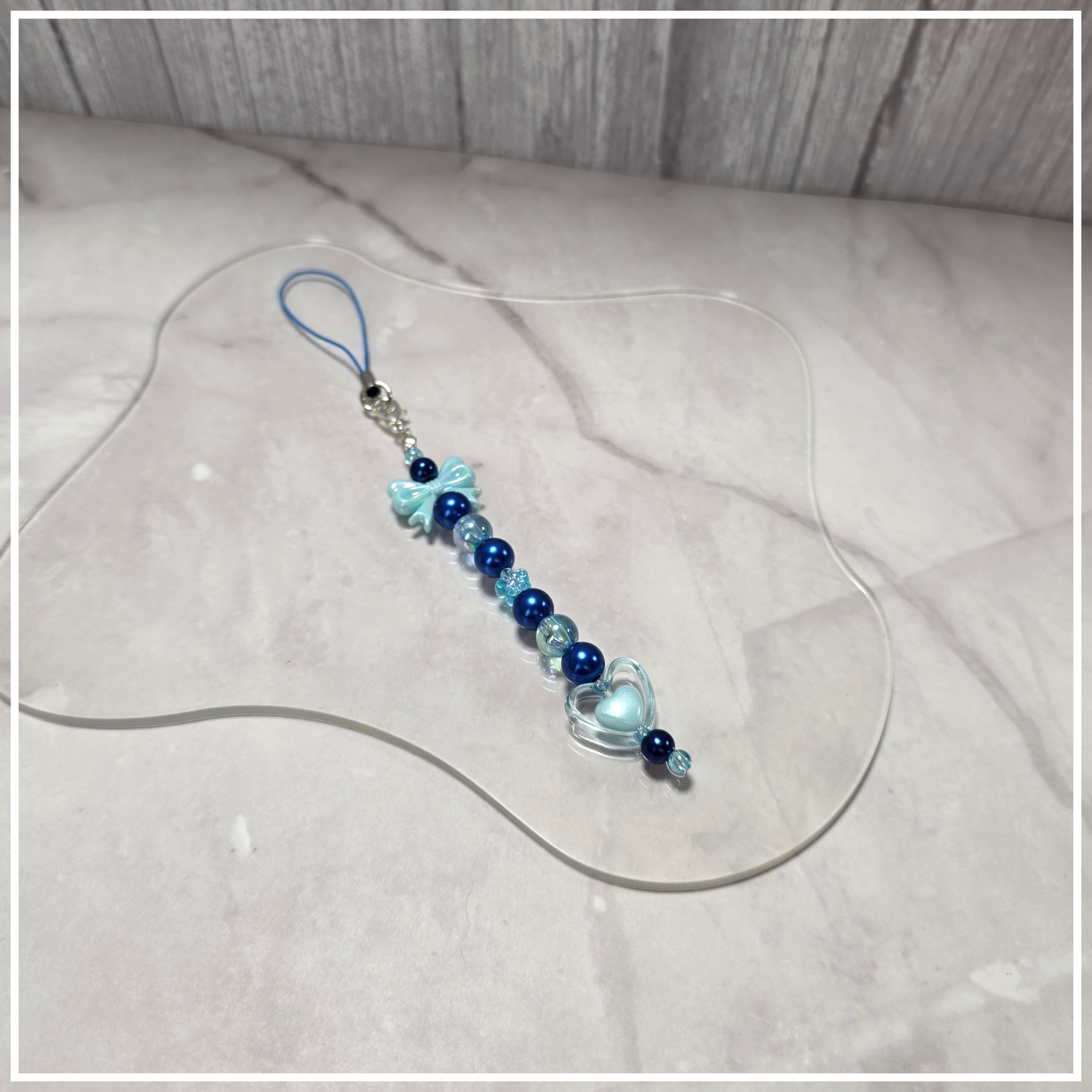 青いリボンとハートがあしらわれた、心温まるストラップです。パールブルーとクリアブルーの絶妙な組み合わせが魅力的で、全長17㎝のボールチップから下が9.5㎝のデザインは、可愛らしさとおしゃれさを兼ね備えています!特別なシーンから普段使いまで、あなたのスタイルにさりげない華やかさを演出します。