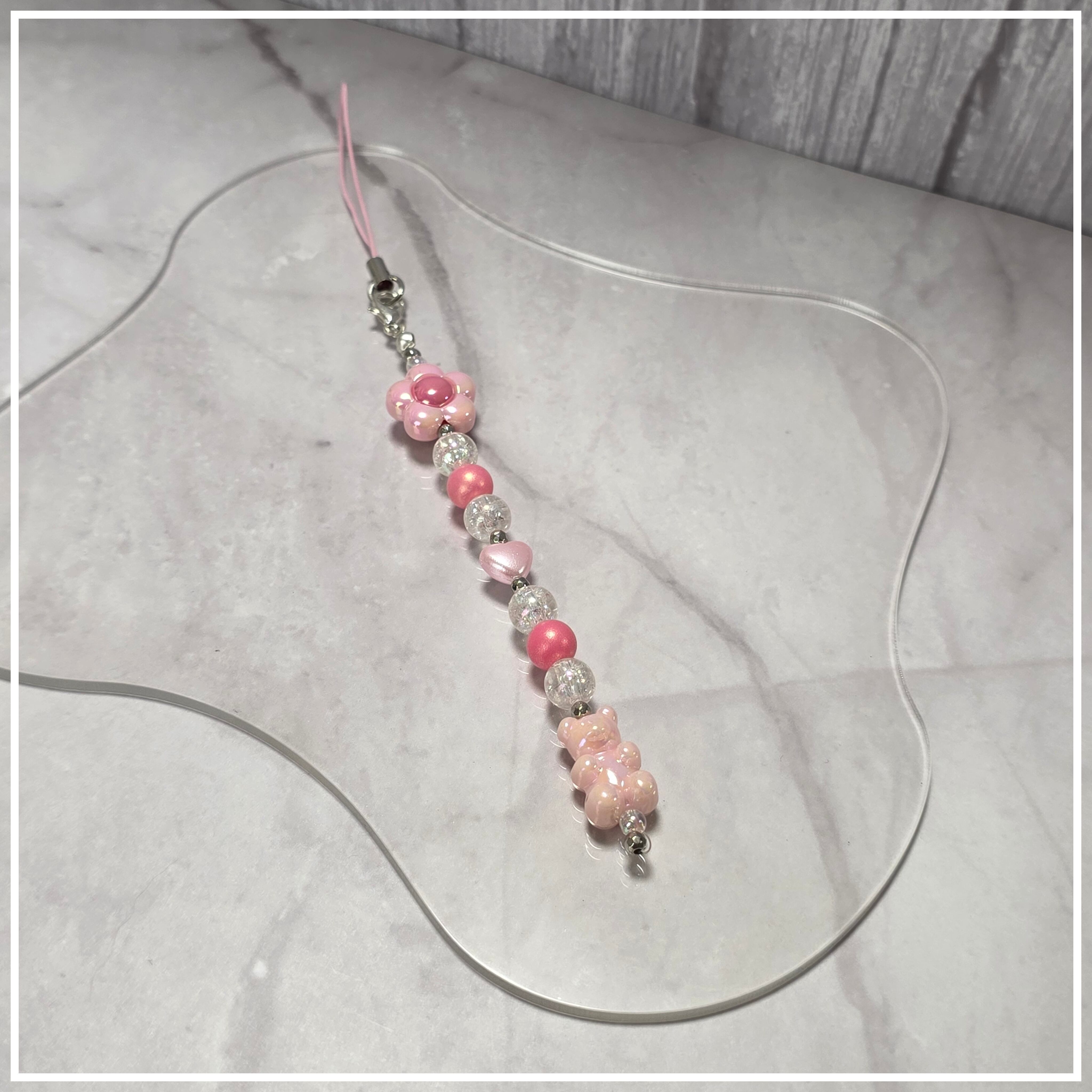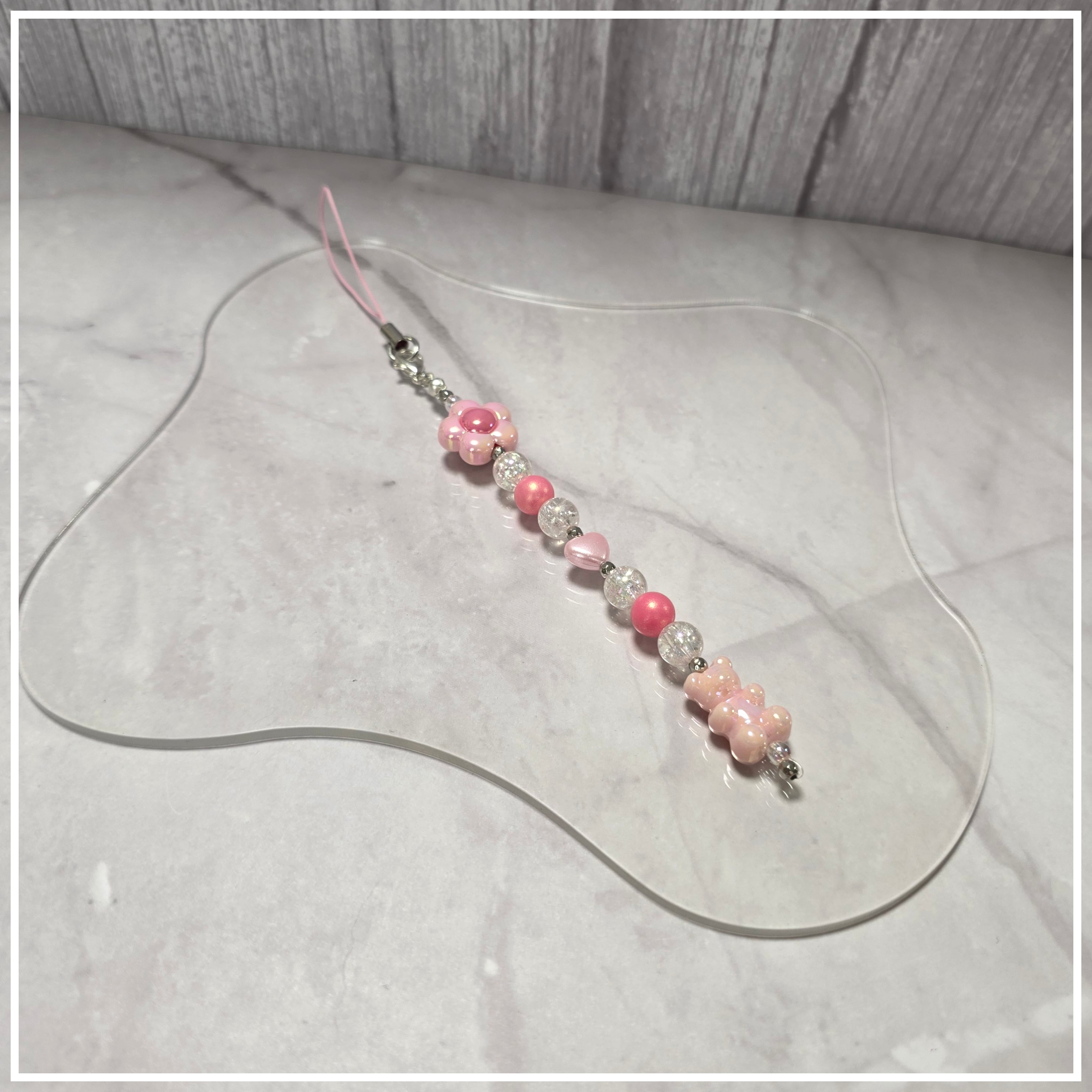柔らかなピンクのクマと華やかな花がデザインされた、心温まるストラップです。全長17.5㎝のボールチップから下の部分が11㎝になるこのストラップは、一年中お楽しみいただけるデザインで、可愛らしさとおしゃれさを兼ね備えています!大切な人へのギフトや、自分自身のスタイルに華を添えるアイテムとしてもぴったりです。