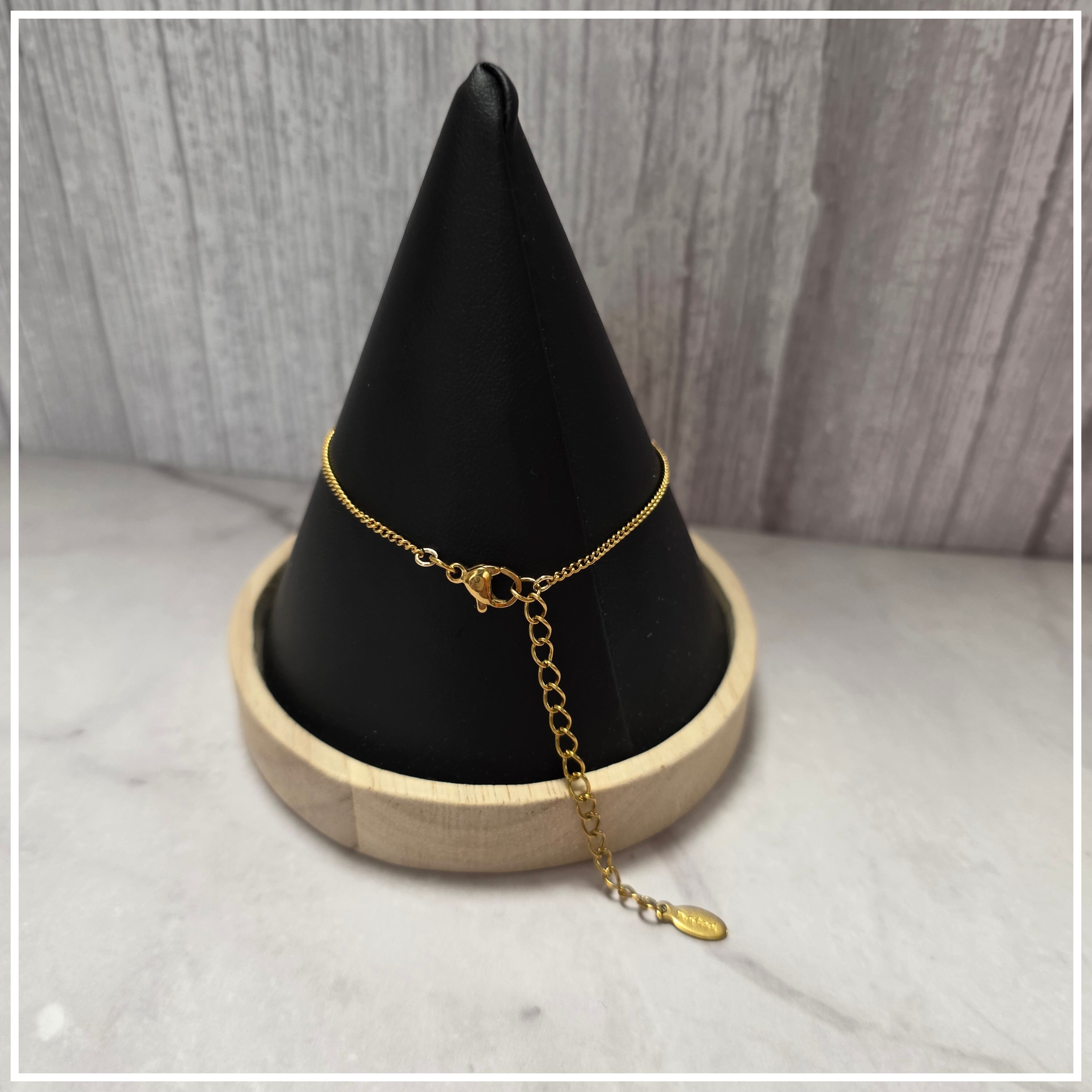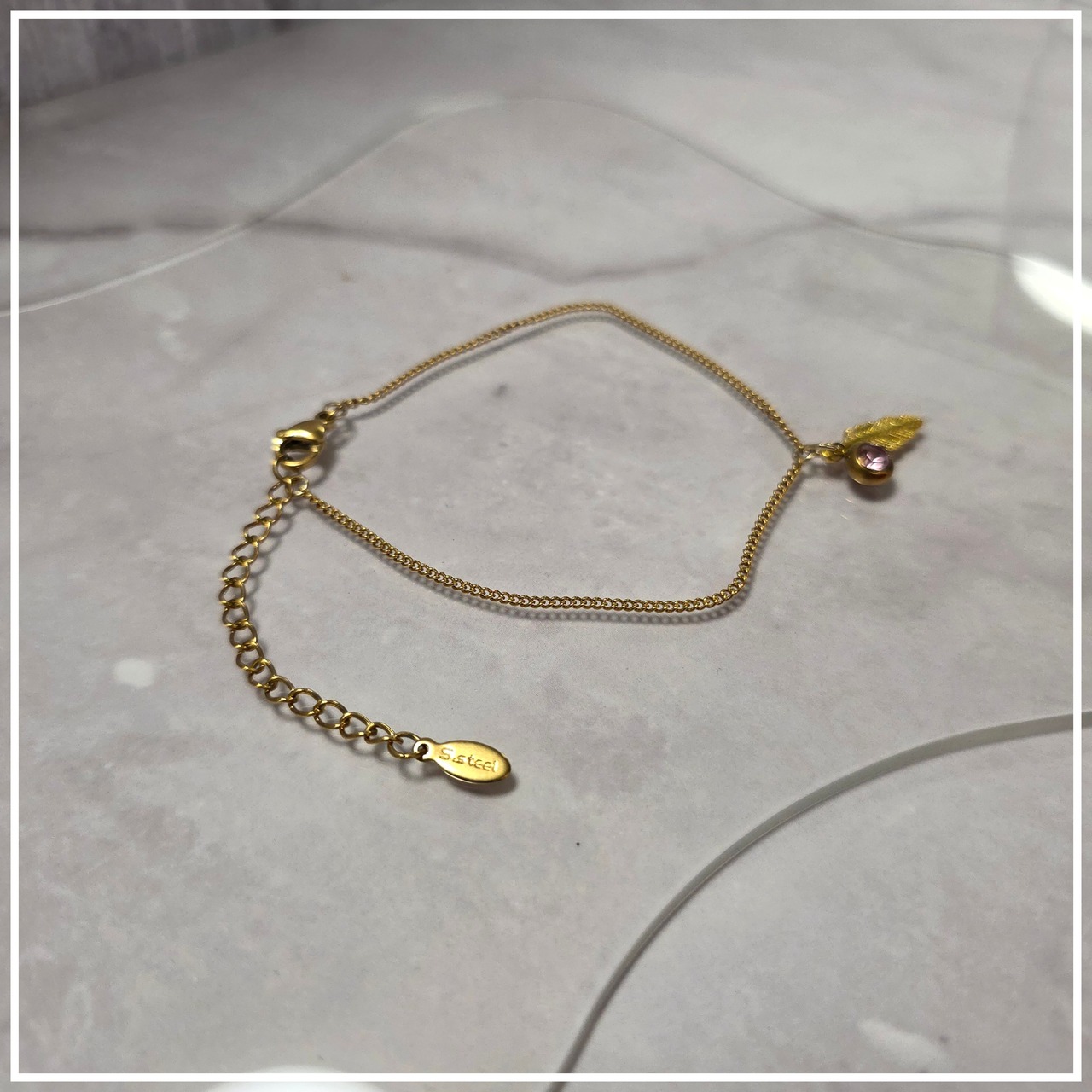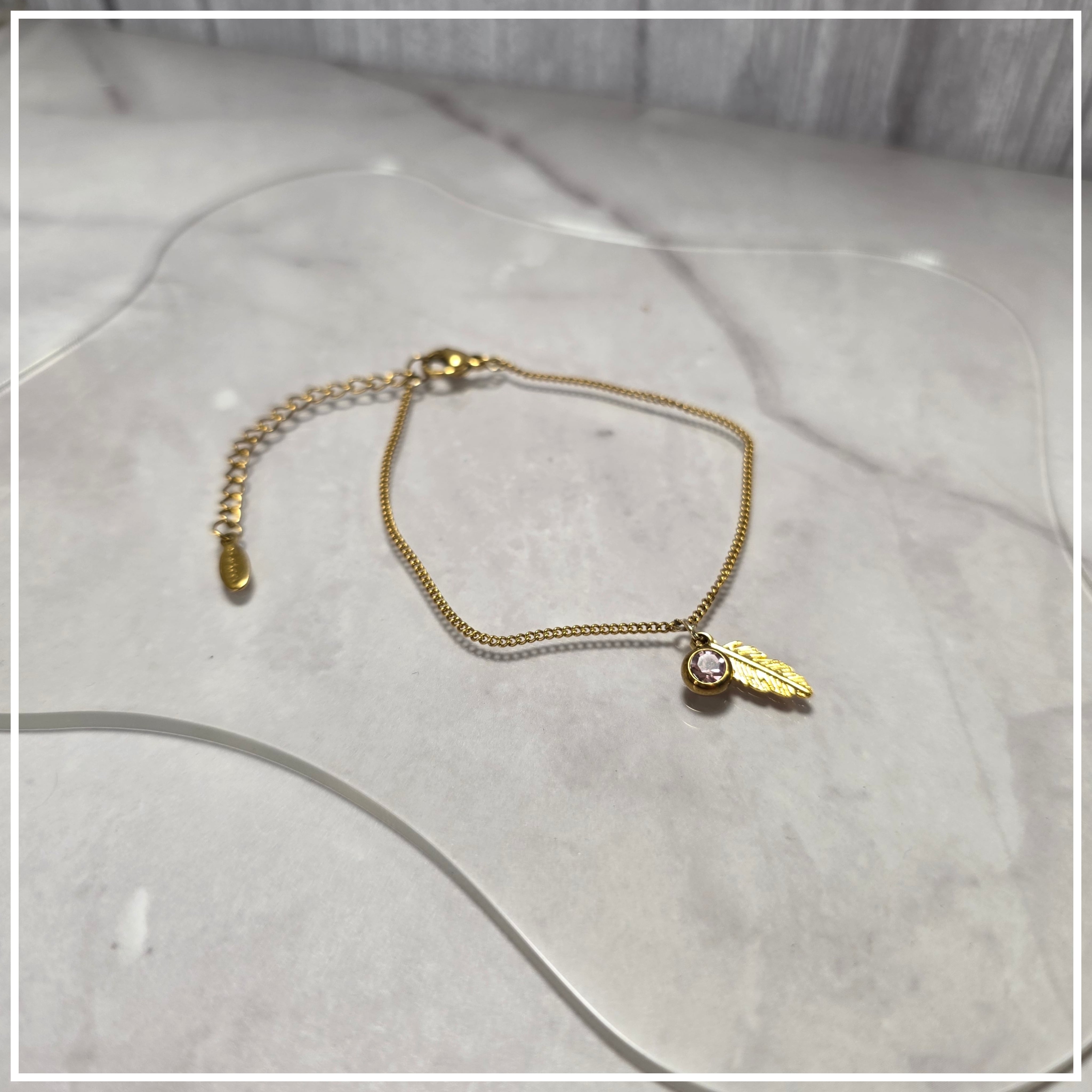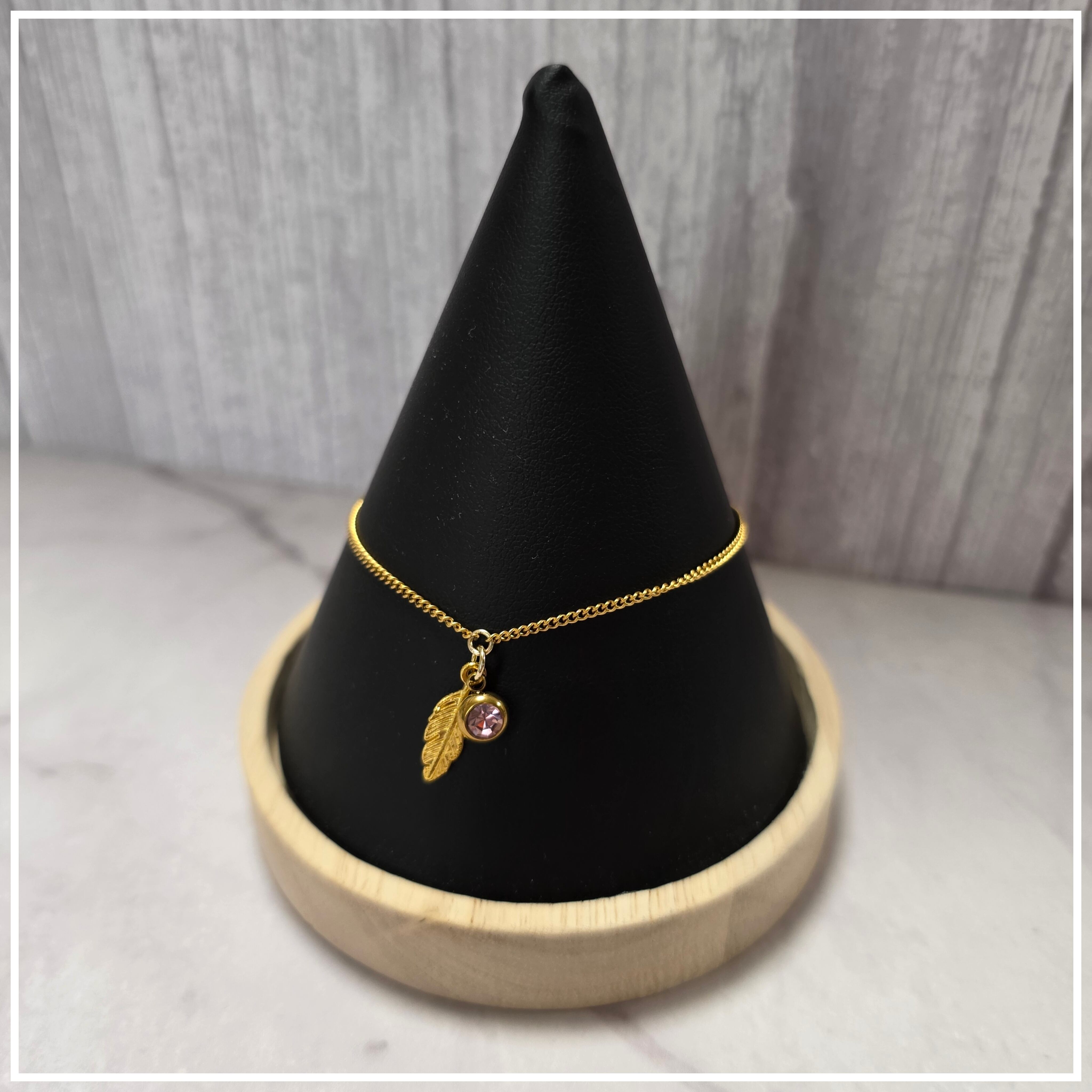 優雅なゴールドカラーのチェーンと、薄ピンクのラインストーンが美しく輝くブレスレット羽根です。金属アレルギーに配慮したサージカルステンレス素材を使用しているため、肌に優しく安心してお使いいただけます!サイズは19㎝から24㎝まで調整可能で、手首にぴったりとフィットします。